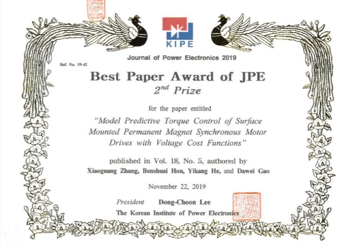 近日,从韩国电力电子学会KIPE (The Korean Institute of Power Electronics)获悉,永利官网电气与控制工程学院教师张晓光于2018年在国际学术期刊Journal of Power Electronics发表的论文“Model Predictive Torque Control of Surface Mounted Permanent Magnet Synchronous Motor Drives with Voltage Cost Functions”(第18卷5期)被评为该期刊2019年度最佳论文。Journal of Power Electronics期刊由韩国电力电子学会主办,是SCI...