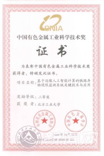 近日,中国有色金属工业协会、中国有色金属学会公布了2020年度中国有色金属工业科学技术奖授奖项目,永利官网作为第一完成单位申报的“基于边缘人工智能计算的铁路异物侵限监测系统关键技术与应用”项目获得二等奖。