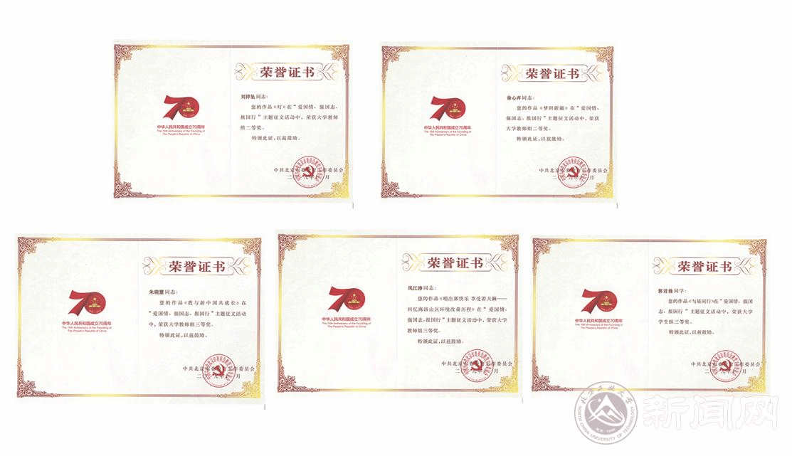 日前,“爱国情、强国志、报国行”主题征文活动评选结果揭晓,永利官网共有5项作品获奖,获奖数量名列北京市属高校前茅。其中,刘祥坠老师的《灯》、徐心卉老师的《梦回新疆》荣获大学教师组二等奖,朱晓慧老师的《我与新中国共成长》、凤江涛老师的《唱出那快乐 享受着天籁》荣获大学教师组三等奖;郭君姝同学的作品《与星同行》荣获大学学生组三等奖。学校荣获征文活动“优秀组织奖”,全市仅有10所高校获此奖励。