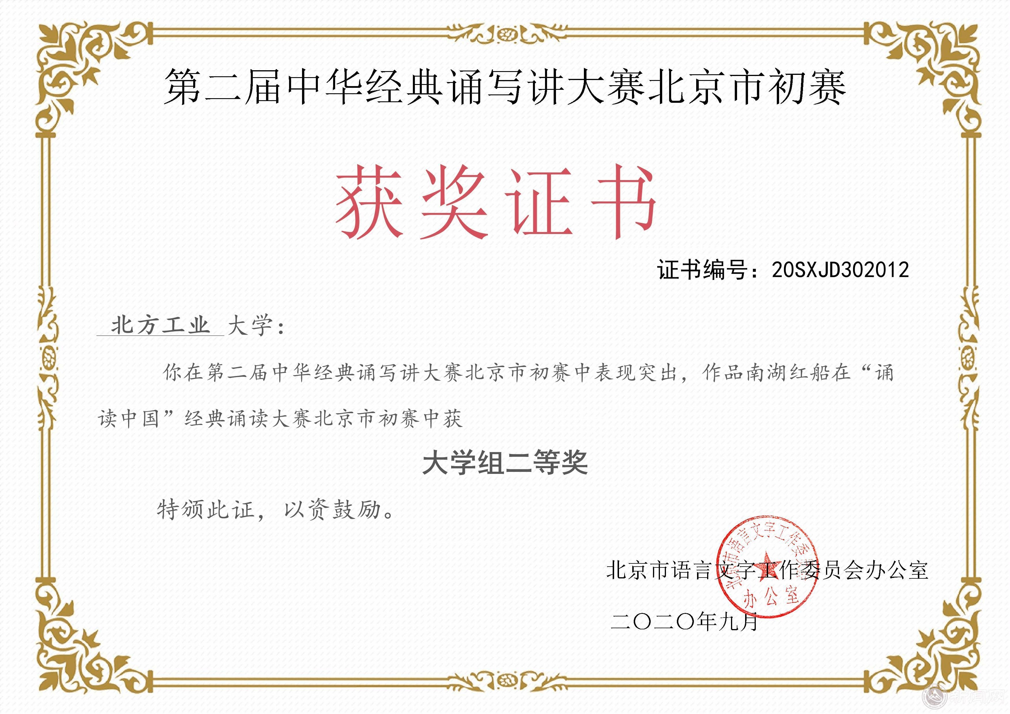 近日,第二届中华经典诵写讲大赛北京市初赛获奖名单公布,永利官网选送的作品《战瘟神》(朗诵者:李文浩、王志健、唐浩然、杨徐子琳、李砚辉、兰青)、《南湖红船》(朗诵者:张若瑶、刘辰茜、李砚辉、唐浩然、李文浩)在“诵读中国”经典诵读大赛中双双获得大学组二等奖,永利官网教师尉峰、孔元明、于隽和张哲获评优秀指导教师。